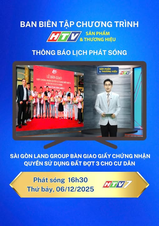Chương trình “Sản phẩm & Thương hiệu” trên HTV7 sẽ chính thức phát sóng phóng sự về Lễ bàn giao Giấy chứng nhận Quyền sử dụng đất (sổ đỏ) đợt 3 của Khu nhà ở Sài Gòn Land 2.
