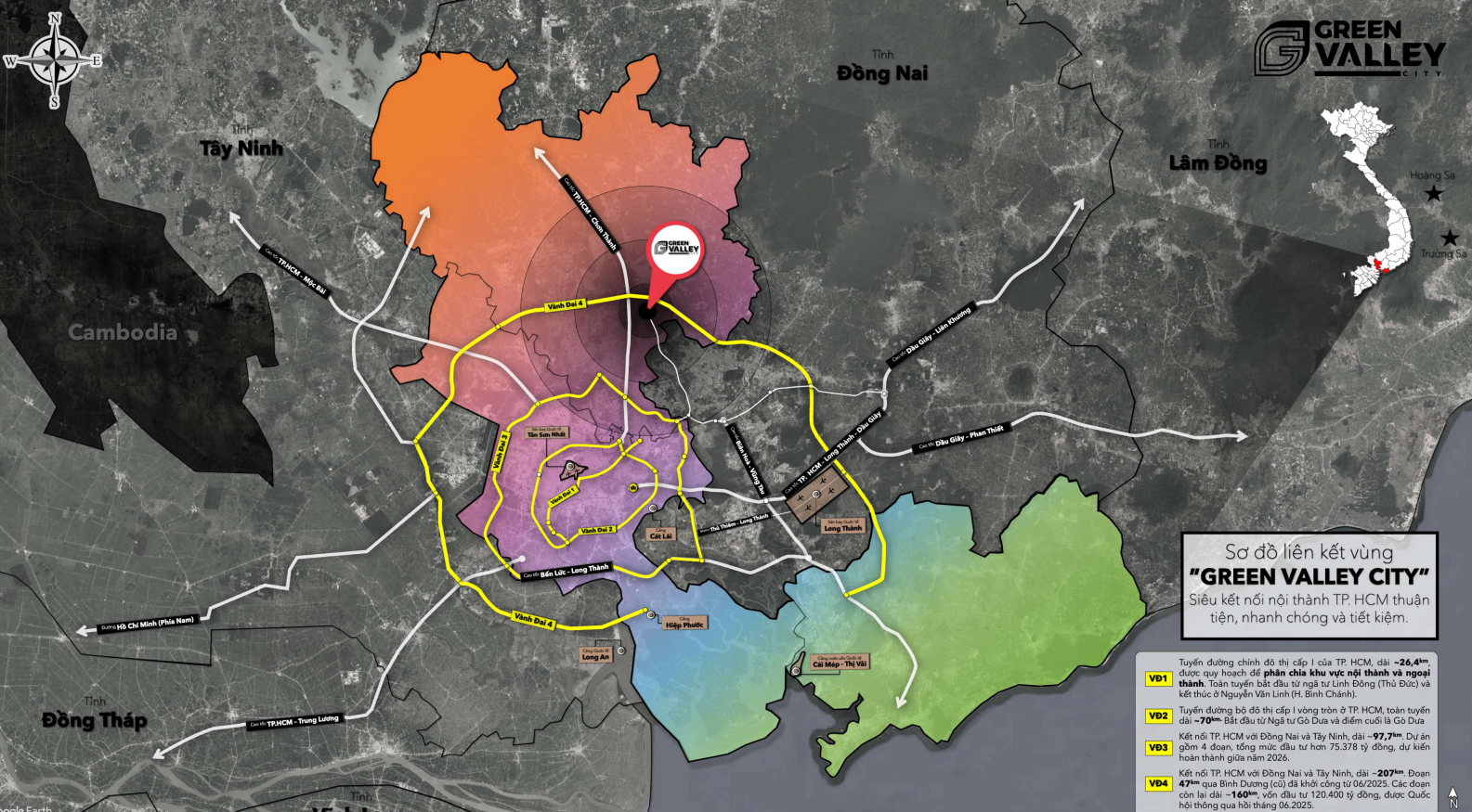 Vị trí và giao thông luôn là mạch máu quyết định sức bật và giá trị bền vững của mọi bất động sản. Tọa lạc đắc địa tại mặt tiền đường liên huyện ĐH 420 Nguyễn Hữu Cảnh, Green Valley City nắm giữ vị thế chiến lược khi kết nối trực tiếp với các trục giao thương huyết mạch. Đây chính là tâm điểm đón trọn làn sóng dịch chuyển dân cư và đầu tư về khu vực Đông Bắc TP.HCM.