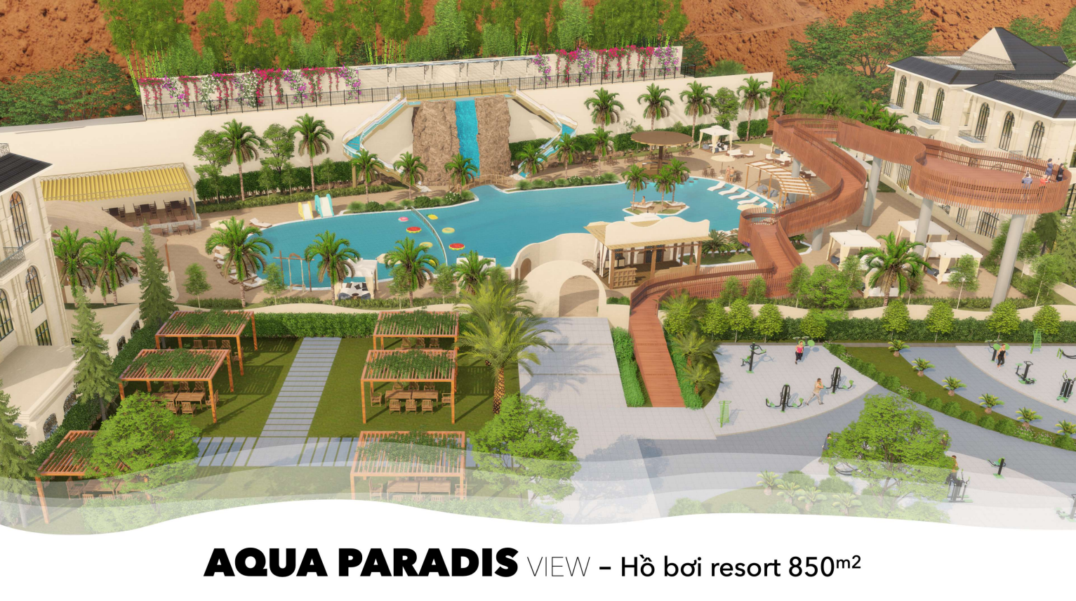 Chất sống resort tiếp tục được khắc họa rõ nét qua khu hồ bơi “Aqua Paradis” rộng 850 m² mang phong cách Địa Trung Hải. Cư dân cũng có thể tìm thấy sự lãng mạn, an yên khi tản bộ trên cầu “Pont Feé” trải dài 75 mét ở độ cao 8 mét, mang lại tầm nhìn panorama ôm trọn vẻ đẹp của thung lũng xanh.